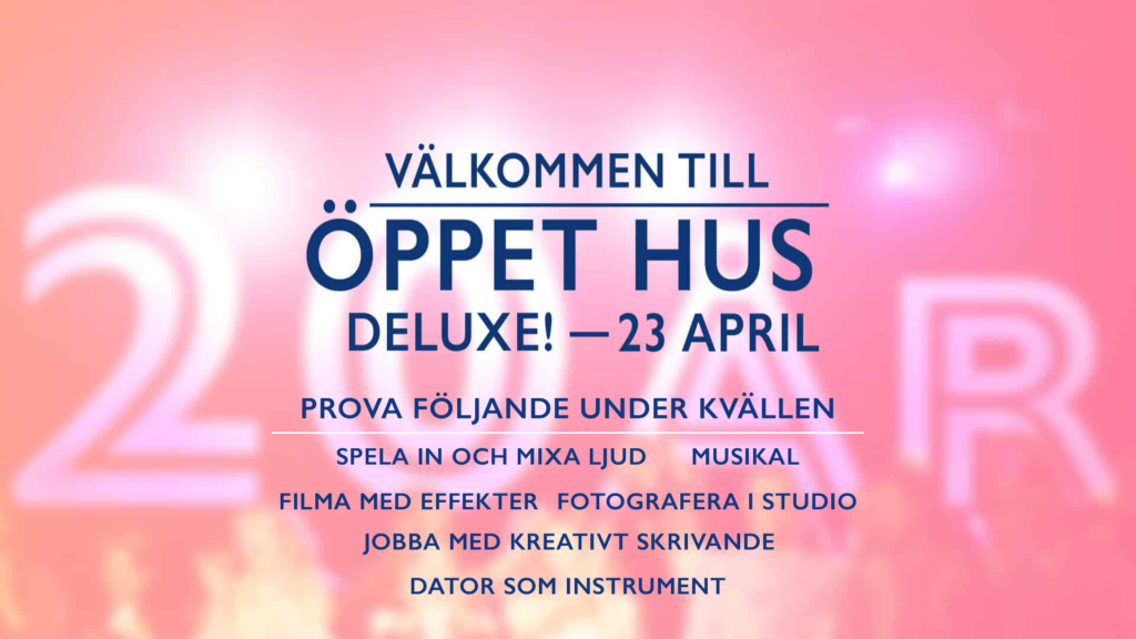 Tisdag 23:e april 17.00-19.30 är det dags för öppet hus där du får möjlighet att prova på olika praktiska moment inom våra utbildningar i skolans härliga lokaler. Vi anordnar specialutformade workshops, där du kan jobba konkret med film, effekter och foto, ljud eller skrivande. Kom hit och träffa lärare och elever, tillsammans stakar vi ut din framtid!